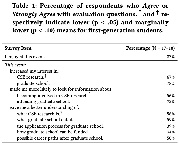 The SPLICE team designed a one-day workshop with presentations from research professors, hands-on cybersecurity demos, a panel discussion with current and recent graduate students in Computer Science and Engineering (CS&E), and a participation survey. The goal of the workshop was for students to: understand what graduate school in CS&E entails, familiarize themselves with the graduate application process, learn different ways graduate school can be funded, discover possible career paths post-graduate school, and be more confident that graduate school is an option for them.